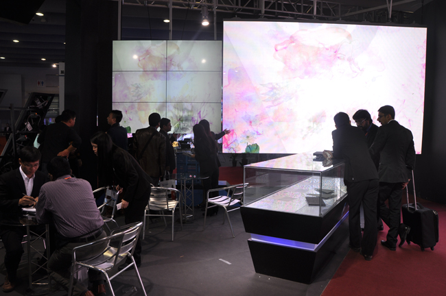 此外,明興光展臺主要以P4室內外弧LED顯示屏為中心,左右分別為P3.91室內LED顯示屏、P8戶外表貼LED顯示屏以及兩側擺放LED廣告機及LED異形屏搭載多屏控制系統(tǒng)、現(xiàn)場擁有超強震撼效果,令人點贊。