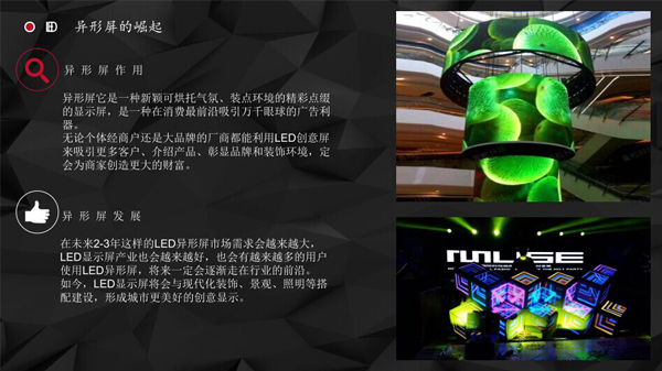 LED異形屏它是一種新穎可烘托氣氛、裝點(diǎn)環(huán)境的精彩點(diǎn)綴的顯示屏,是一種在消費(fèi)最前沿吸引萬千眼球的廣告利器。